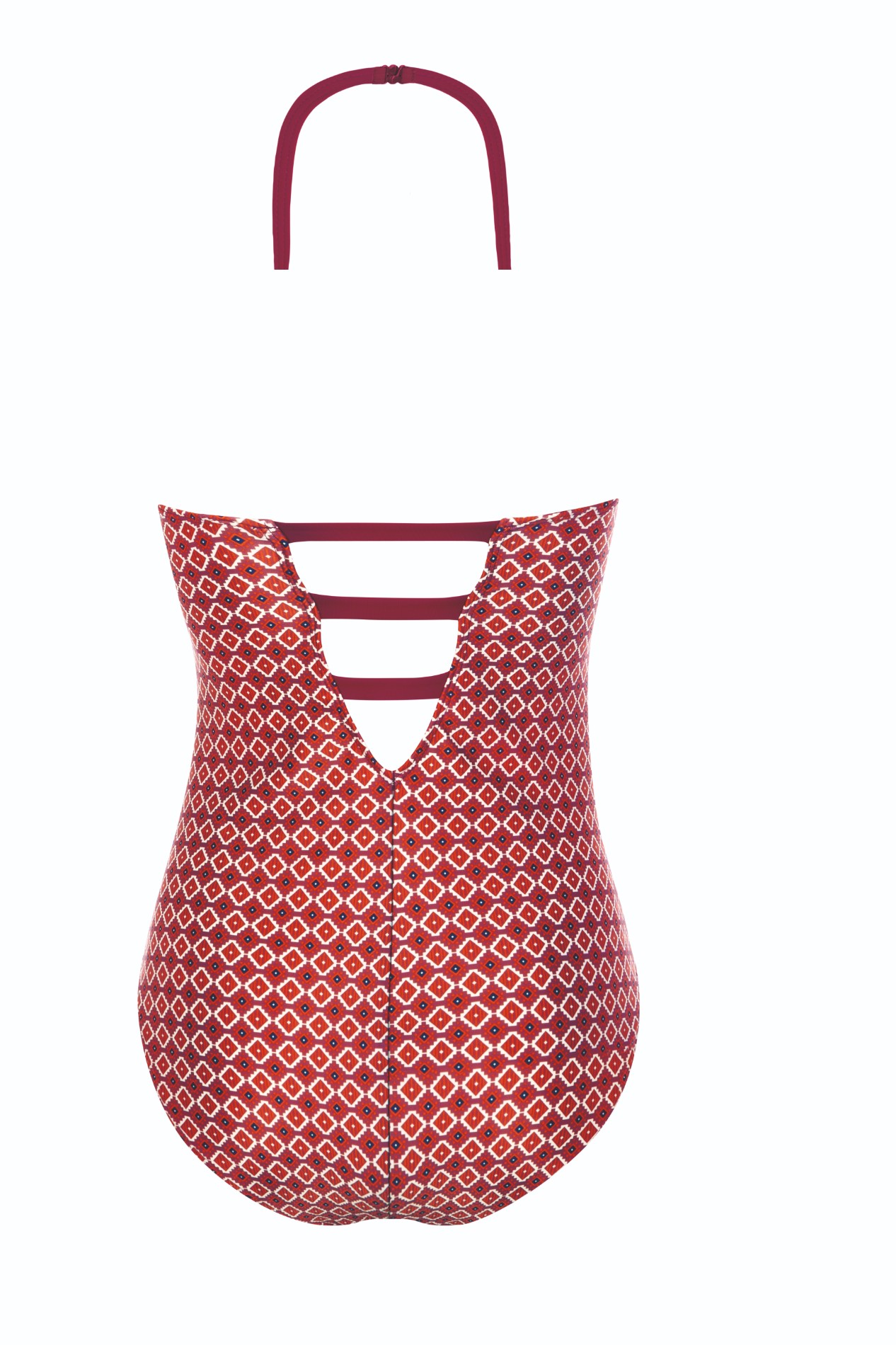 Kopējais peldkostīms siltos krāsu toņos ar enerģisku apdruku.